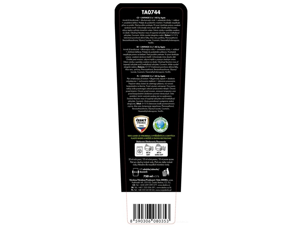Prémiový dvousložkový avivážní kondicionér s antistatickým účinkem, vysoce účinným změkčovačem a bohatou parfemací, navržený pro poslední máchání v pračce i pro ruční praní.