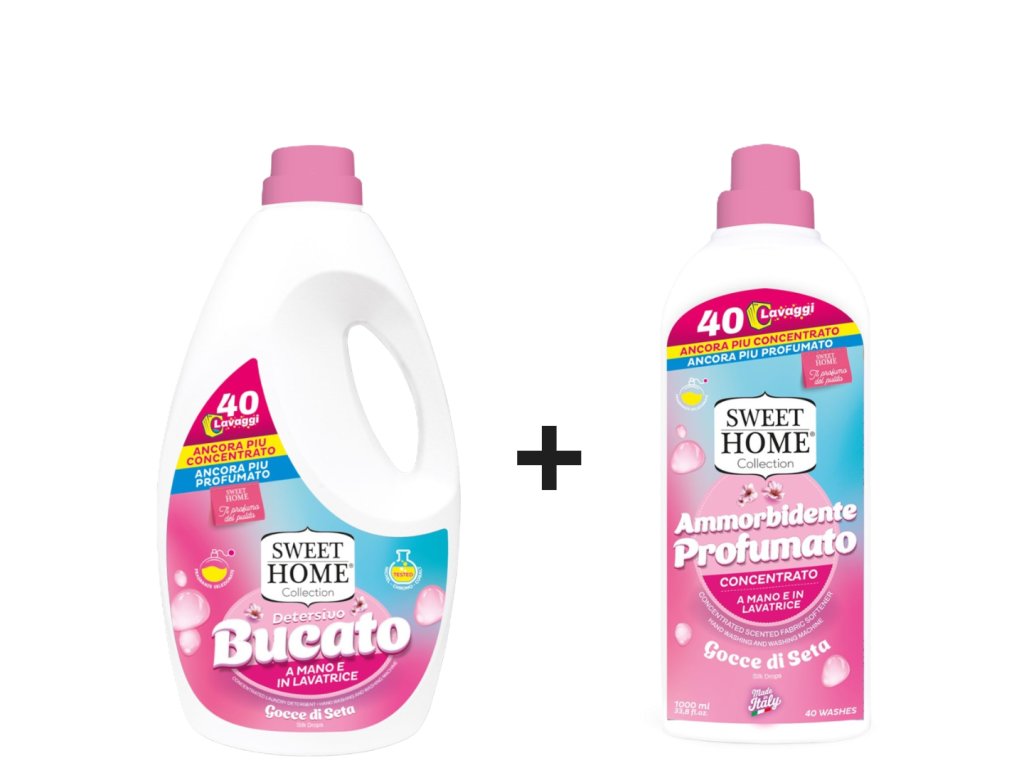 Objevte spojení jemnosti a elegance se sadou Sweet Home prací gel + aviváž Kapky hedvábí.