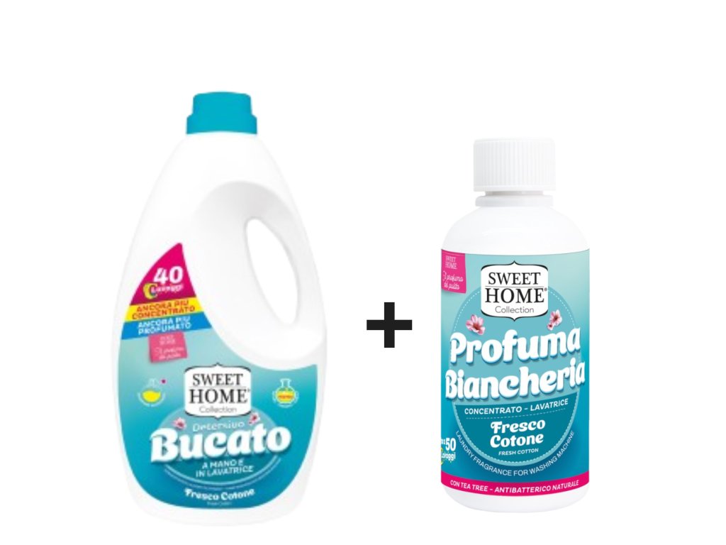 Vychutnejte si harmonii čistoty a svěží vůně s exkluzivní sadou Sweet Home prací gel + parfém na praní Svěží bavlna.